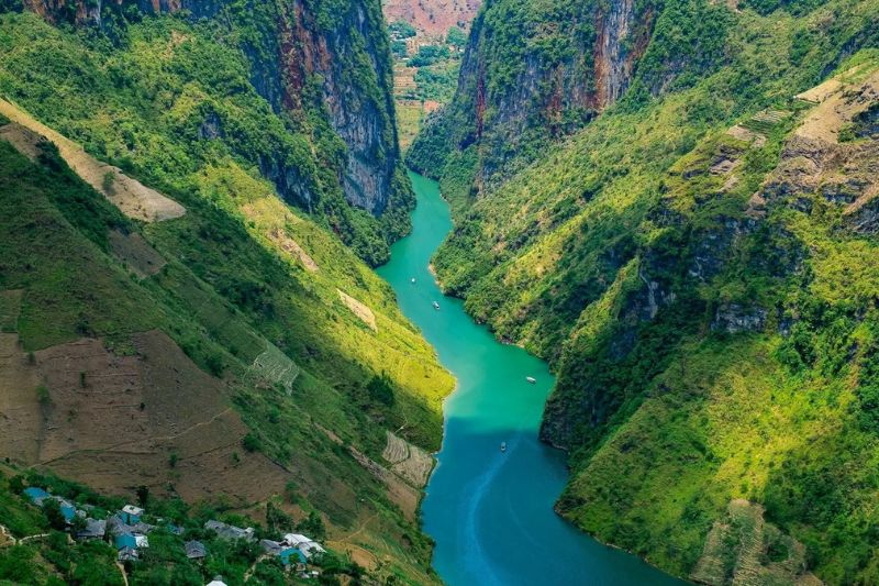 Dòng sông Nho Quế, bắt nguồn từ vùng núi cao của Trung Quốc và chảy vào Việt Nam, là điểm nhấn không thể thiếu trong hành trình khám phá Hà Giang. Dòng nước màu xanh ngọc bích đặc trưng uốn lượn qua các khe núi, tạo nên một khung cảnh trữ tình và hùng vĩ.